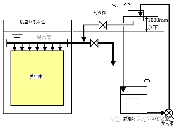 (2)膜元件的药液清洗(频率:同一过滤流量下跨膜压差比初期稳定运行时的跨膜压差高5kPa时,或者每半年一次,择两者间更短时间内进行一次药液清洗。)